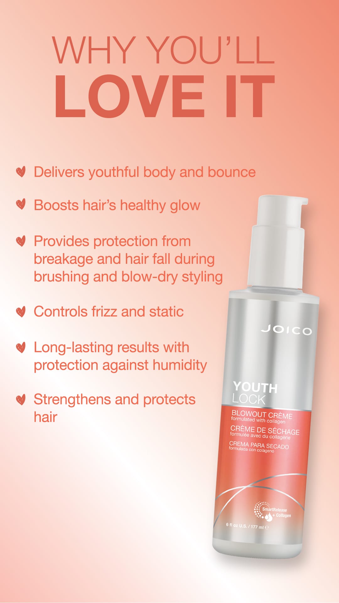 Leyfðu þér að elska hárið þitt, á hvaða aldri sem er með Joico YOUTHLOCK: okkar einstöku línu sem endurheimtir æskufulla lyftingu, gljáa og viðráðanleika; um leið og hárið fær aukinn styrk og ljóma.